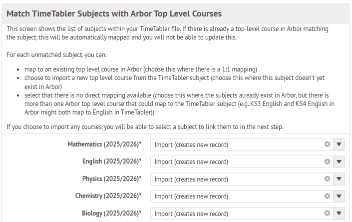 This section allows you to import, match, skip, or amend Courses and Classes/Teaching Groups in Arbor for your timetable. We do not migrate this information from SIMS, so ensuring your school's TimeTabler file is accurate will facilitate easy data import into Arbor. The process has 3 stages.