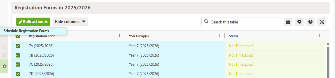 Go to Timetable > Timetable Administration > Schedule Registration Sessions. Here you can select the registration forms you want using the checkboxes, and schedule AM and PM registration form times.
