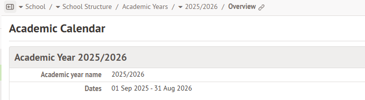 - This can be viewed in School > School Structure > Academic Years > 2025/2026 > Overview.