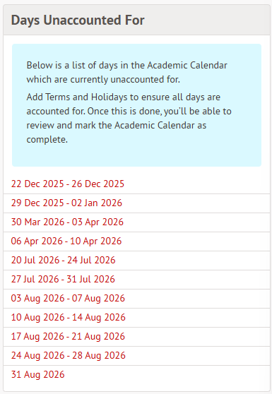 - Once the school has migrated, the school will have visibility of the "Days unaccounted for" in Arbor, which can be used as a guide for the date they will need to assign holiday to.