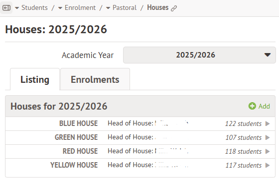 - This can be viewed in Students > Enrolment > Pastoral > Houses.