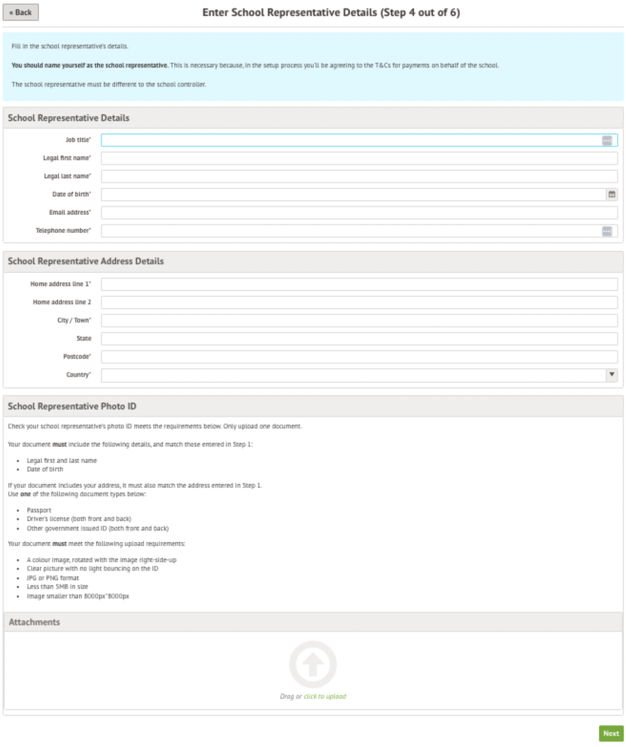 Now that you have added your school Representative's details and uploaded their ID, click the green Next button to proceed and move on to the following guide in this series: Adding a bank account for payouts