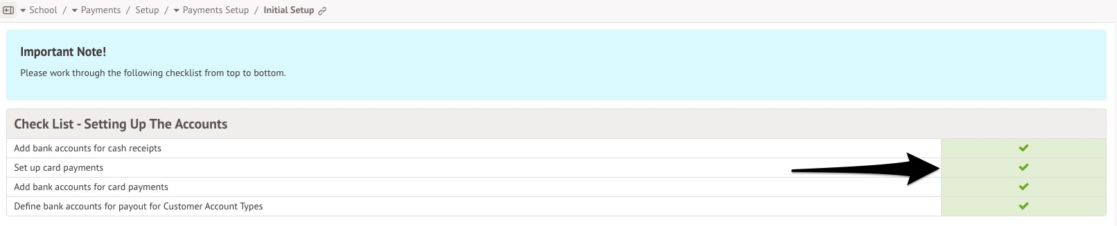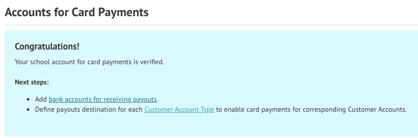 Once your payment identity verification is complete, you will see a green tick next to Set up card payments on the School > Payments > Setup page.