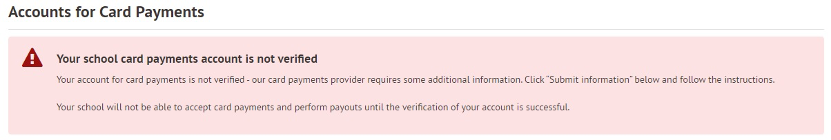 If payment identity verification has failed or has become unverified, staff with the Finance: Administer permission see notices advising Your school card payments account is not verified on their homepage and on the School > Payments > Setup page.