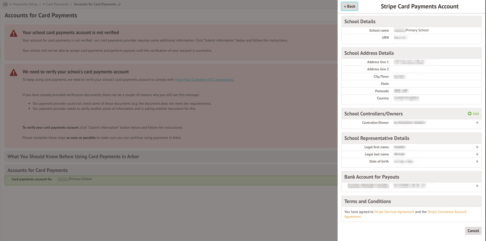 - Check and adjust the controller/owner address and contact information. Go to School > Payments > Setup > [in the table] and Set up card payments. Then, click on the Card Payments account for the Owner/controller's name on the slide over.