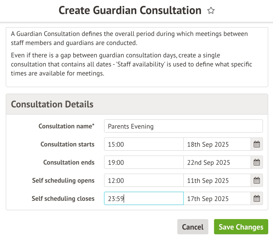 This article is the second in our series on Setting up Guardian Consultations (Parents' Evenings). This guide covers adding your consultation, picking dates and choosing a self-scheduling period for parents.