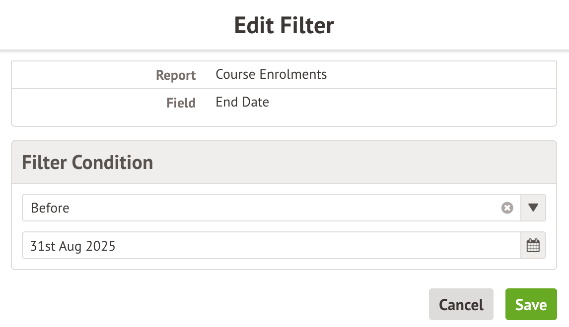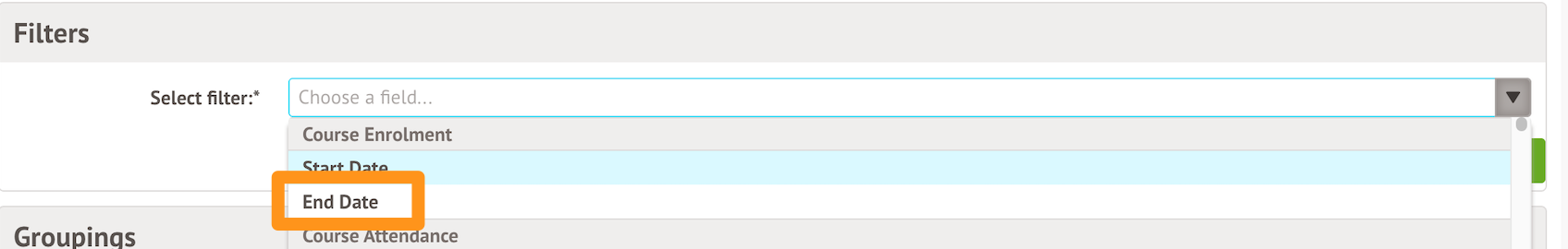 From the drop down, select the filter that you are interested in. For example, if you would like your report to only show specific course enrolment end dates, you could choose the End date filter.