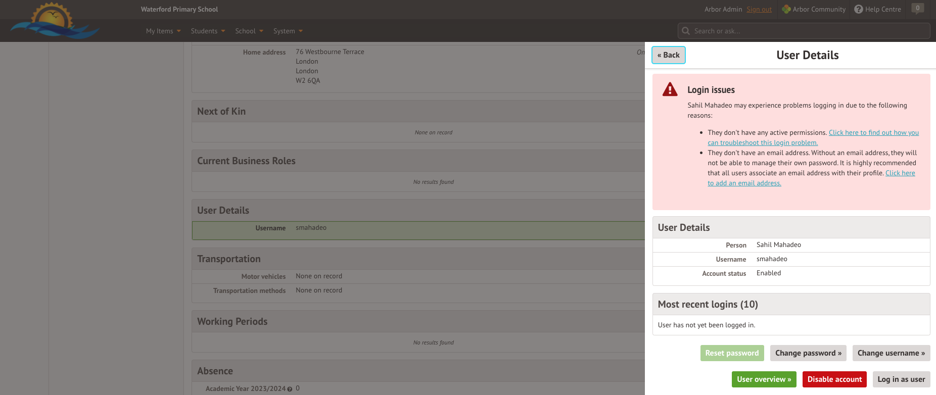 Top tip: You can see the reasons why any user is unable to access your school site. If you click on the User Details section of any staff, guardian, or student profile, you will be able to see why that user's profile cannot be logged into, and how to resolve this.