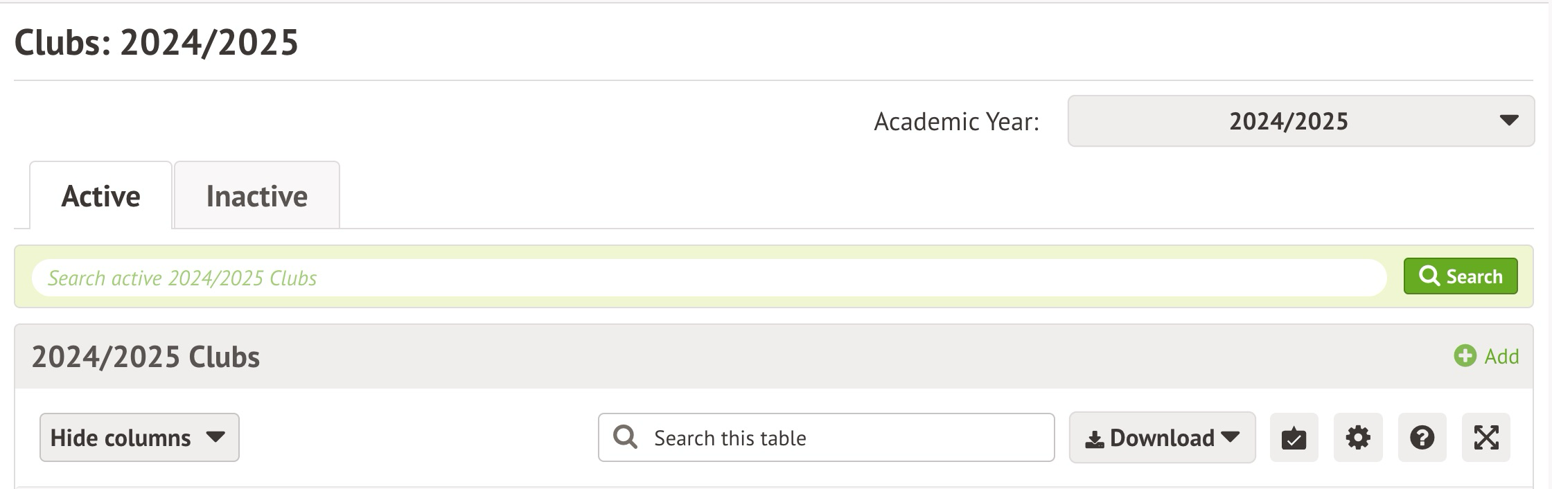 On the Active tab, you see clubs that have future sessions scheduled and those that have not been fully set up yet (no sessions, past or future). The Inactive tab displays clubs that have had sessions in the past but have no future sessions.