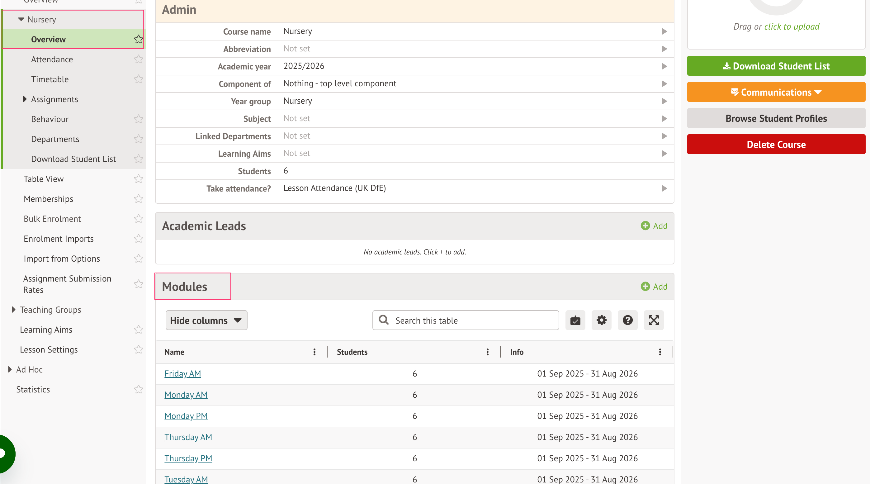 1. Go to the main Nursery course overview (Students > Enrolment > Academic > Courses > Overview > [click on the course] and scroll down to Modules