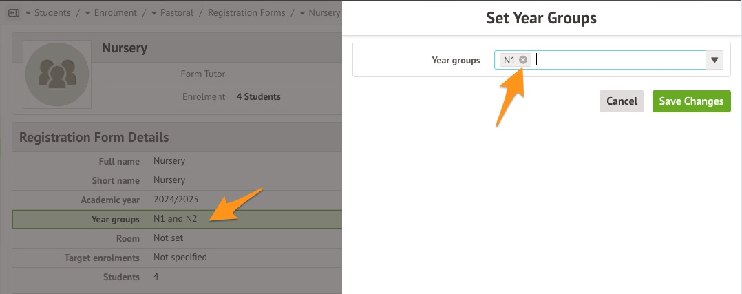 In the Registration form details section, ensure that one of the listed year groups corresponds to your Nursery Year group. If it is not, click on the current year group and add the nursery year group on the slide-over.