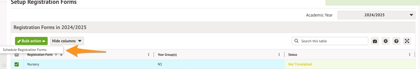 To do this, go to School > Timetable > Timetable Administration > Schedule Registration Sessions, tick the box next to your nursery Registration form, and then use the Bulk Action to Schedule the registration forms.