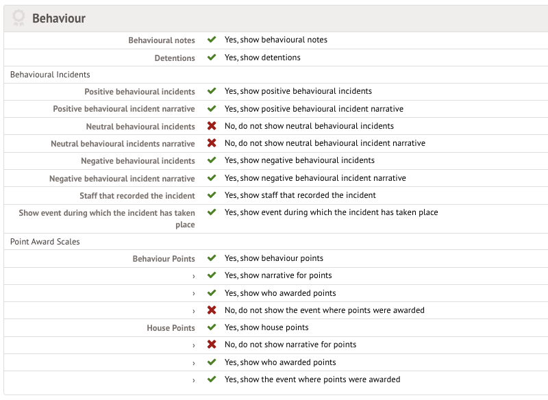 In Behaviour, you can choose to display Notes, Detentions, Behavioural Incidents and Point Award Scales.