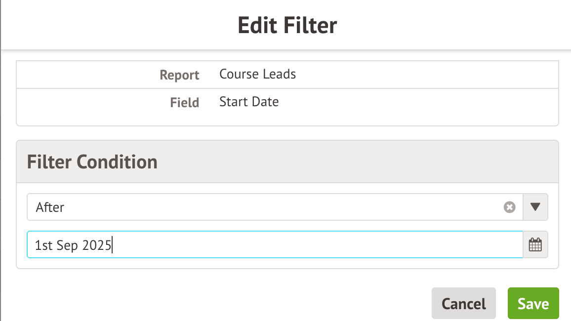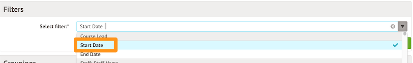 From the drop down, select the filter that you are interested in. For example, if you would like your report to only show specific course lead start dates, you could choose the Start date filter.