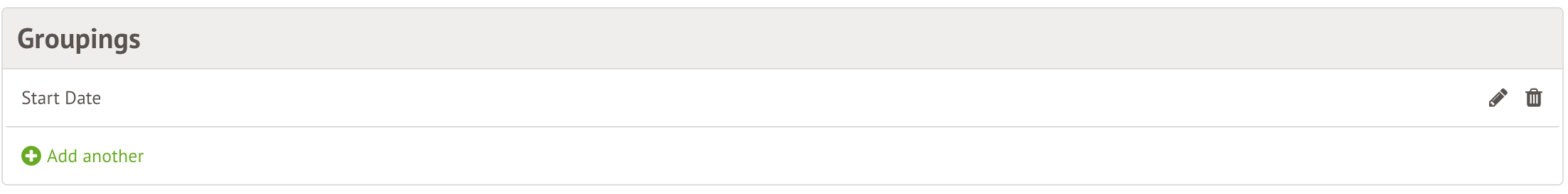 To add a grouping, scroll down to Groupings. From the drop-down, select the grouping that you are interested in, for example, Start date. Then click on the green Add grouping button.