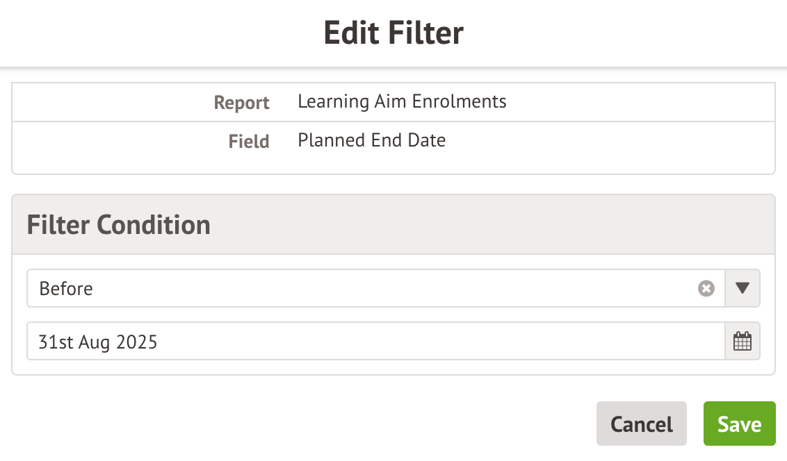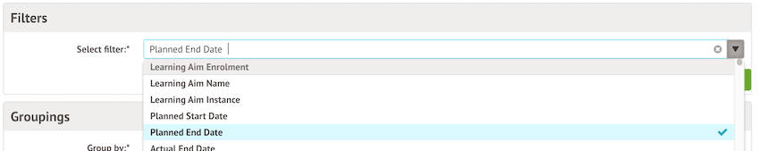 From the drop-down, select the filter that you are interested in. For example, if you would like your report to only show learning aim enrolments with a certain planned end date, you could choose the Planned end date filter.