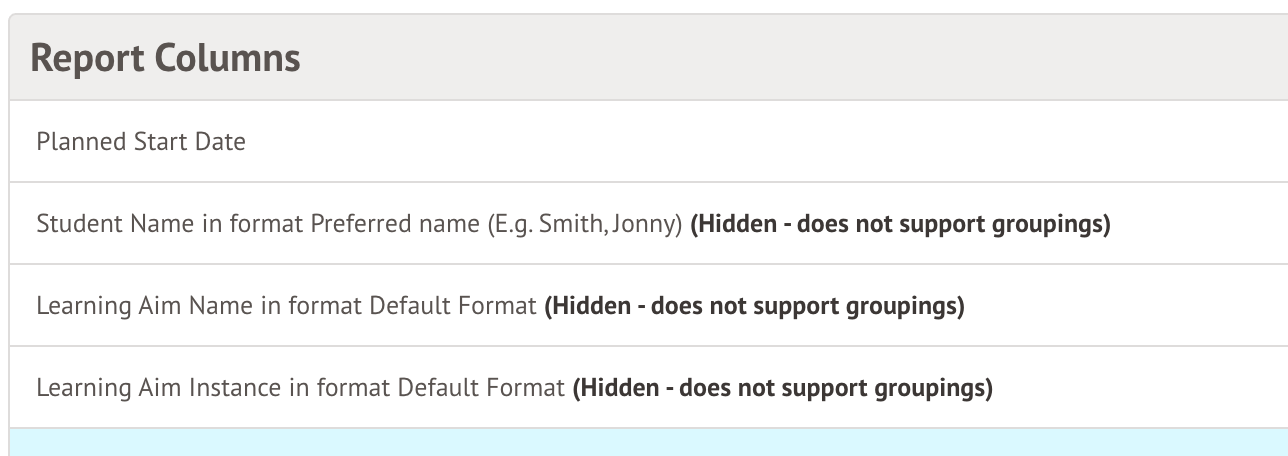 For example, if you add a grouping of Planned start date to the report, you will see how many learning aim enrolments have a certain start date, but you would no longer see the detail of the learning aim enrolment, such as learning aim name, learning aim instance, etc
