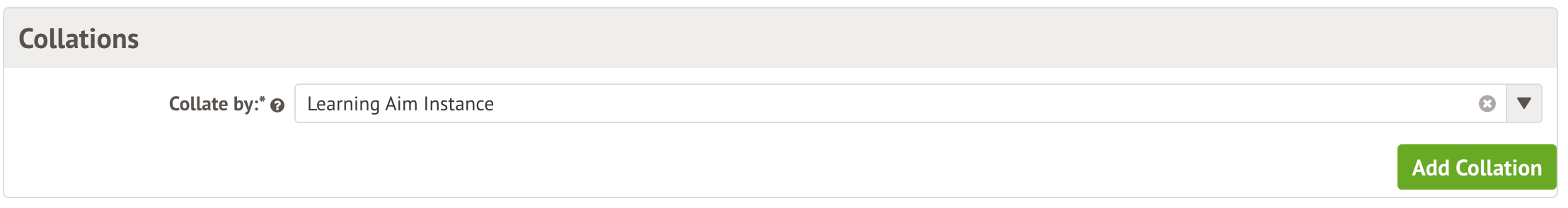To add a collation, scroll down to Collations and then choose the relevant option from the drop-down menu, for example, Learning Aim Instance.