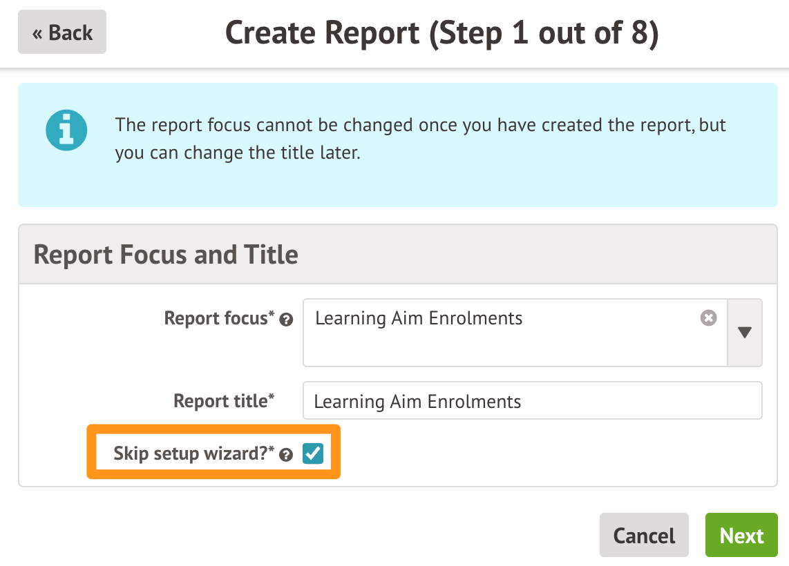 Top Tip: You may find it easier to click 'Skip setup wizard' after choosing your report focus and title to head straight to the main Edit screen.