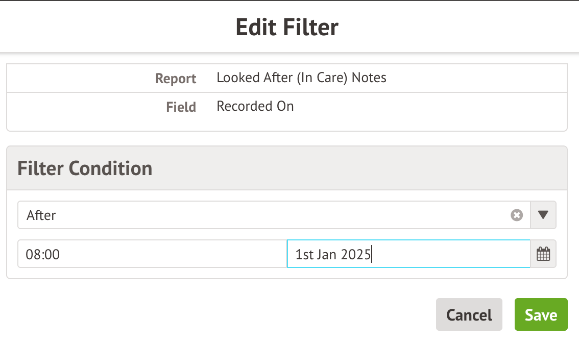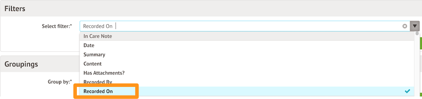 From the drop down, select the filter that you are interested in. For example, if you would like your report to only show Looked After (In care) Notes that were recorded on a certain date, you could choose the Recorded On filter.