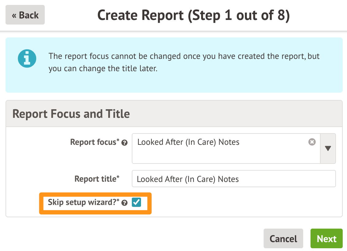 Top Tip: You may find it easier to click 'Skip setup wizard' after choosing your report focus and title to head straight to the main Edit screen.