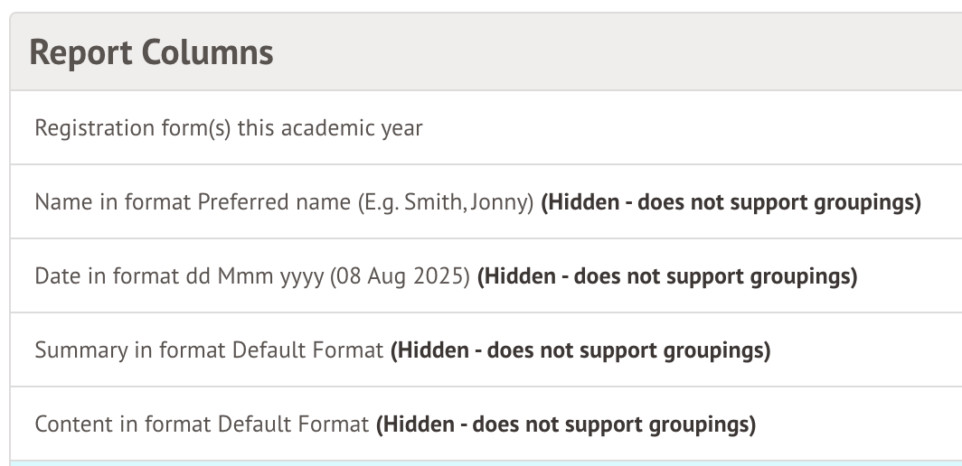 For example, if you add a grouping of Registration Form(s) to the report, you will see how many looked after (in care) notes are recorded for each form group, but you would no longer see the detail of the note, such as the student name, date, etc