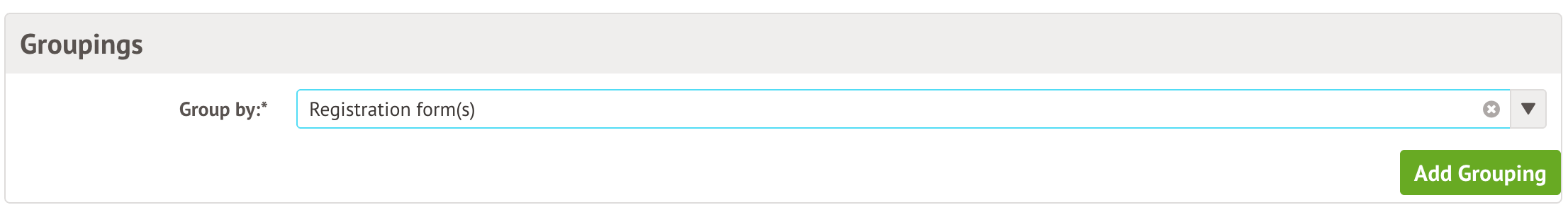To add a grouping, scroll down to Groupings. From the drop-down, select the grouping that you are interested in, for example, Registration Form(s). Then click on the green Add grouping button.