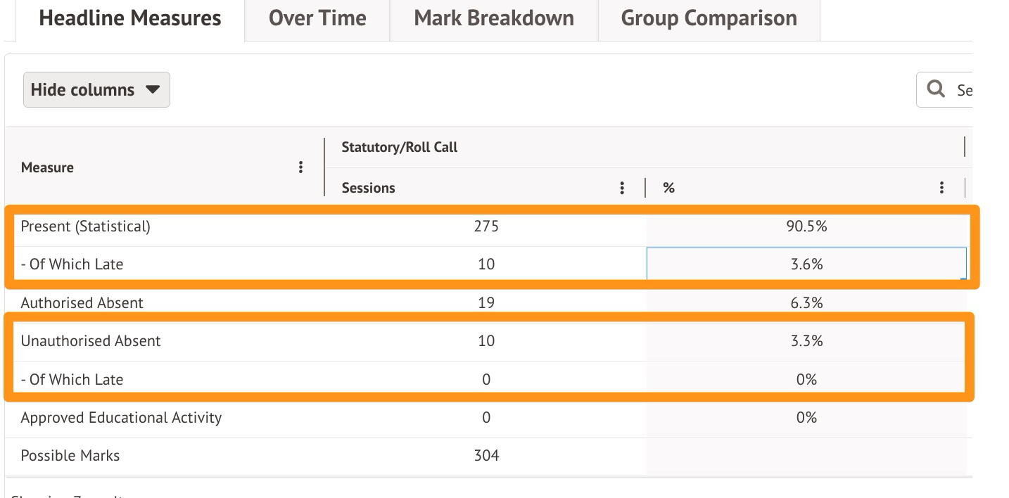 In other words, it looks at the number or percentage of present/unauthorised absent sessions for which the student was also late. This is why these show as "of which late" under a heading like Present (Statistical), |too.