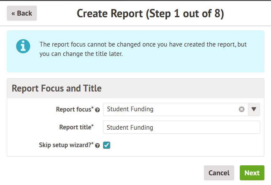 This guide will explain the possible reports you could create when using our custom report writer to create a report using the report focus of Student funding.