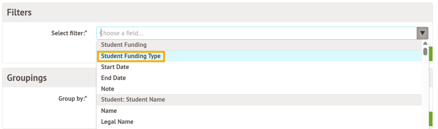 Select Student Funding Type from the drop-down, and then click the green Add filter button on the right-hand side.