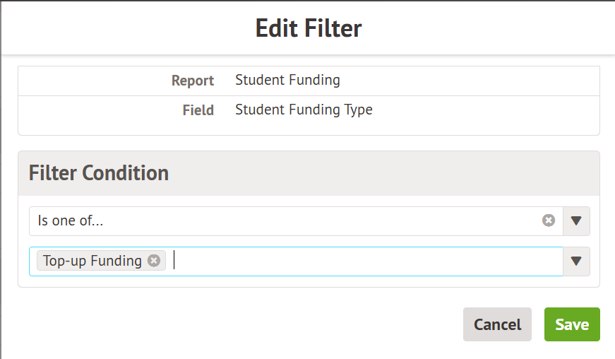 Then you can set your filter parameters. For example, if you select Filter condition: Is one of and select the funding type you want to see, you will see all student fudning records for that funding type.