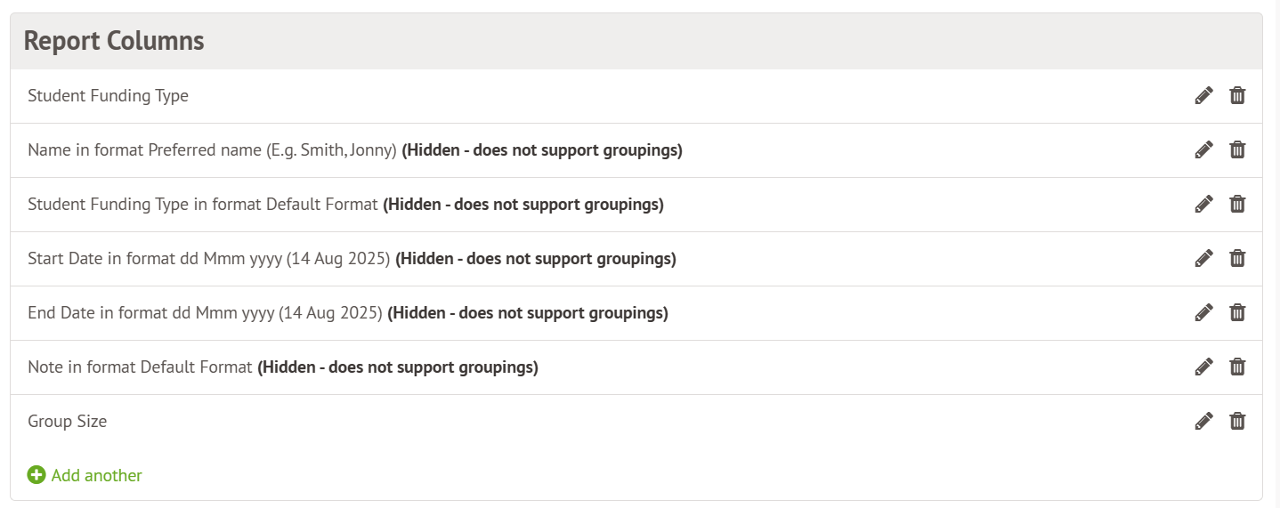 For example, if you add a grouping of Student Funding Type to the report, you will see how many students have been logged for each funding type, but you would no longer see the details for the students, such as the student names, the start/end date, etc.