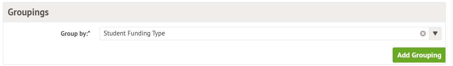 To add a grouping, scroll down to Groupings. From the drop-down, select the grouping that you are interested in, for example, Student Funding Type. Then click on the green Add Grouping button.