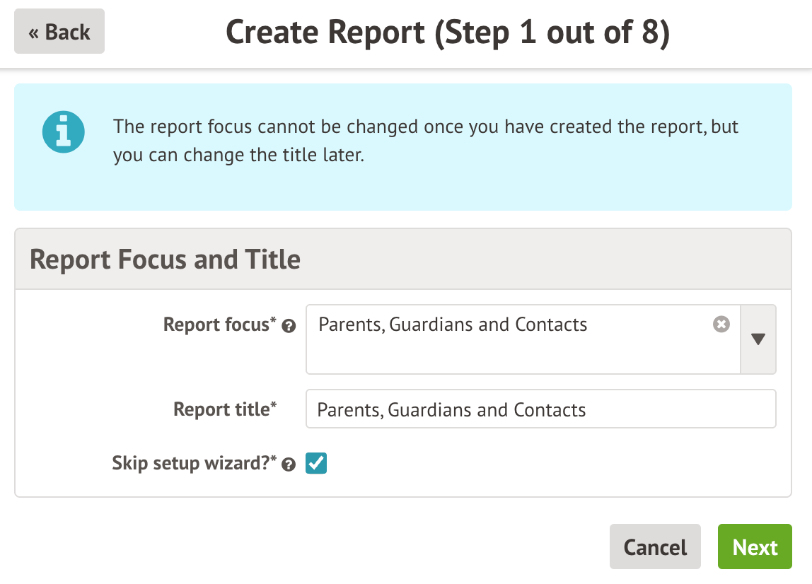 This guide will explain the possible reports you could create when using our custom report writer to create a report using the report focus of Parents, Guardians and Contacts.