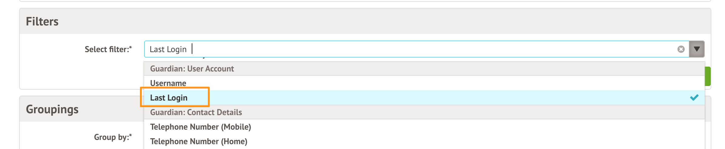 From the drop-down, select the filter that you are interested in. For example, if you would like your report to only show guardians who have logged into Arbor, you could choose the Last login filter, under Guardian: User Account