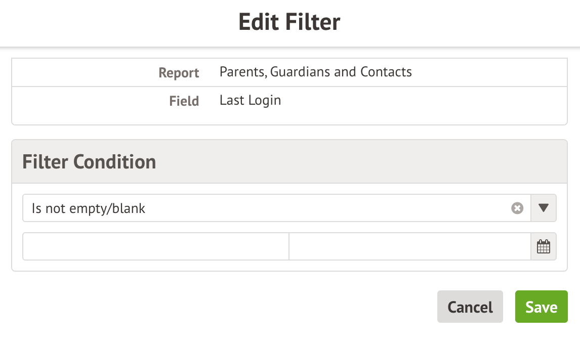 Then you can set your filter parameters. For example, if you select Filter Condition: Is not empty/blank, you will see all Parents, Guardians and Contacts that have ever logged in. Click Save to set this filter.