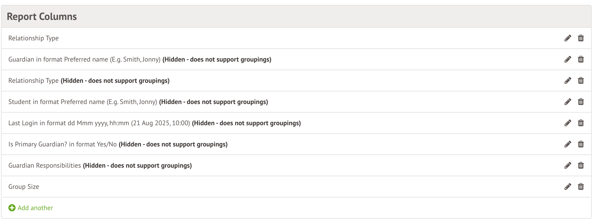 For example, if you add a grouping of Relationship type to the report, you will see how guardians/contacts are Mothers, Fathers, etc., but you would no longer be able to see the details for their Last login.