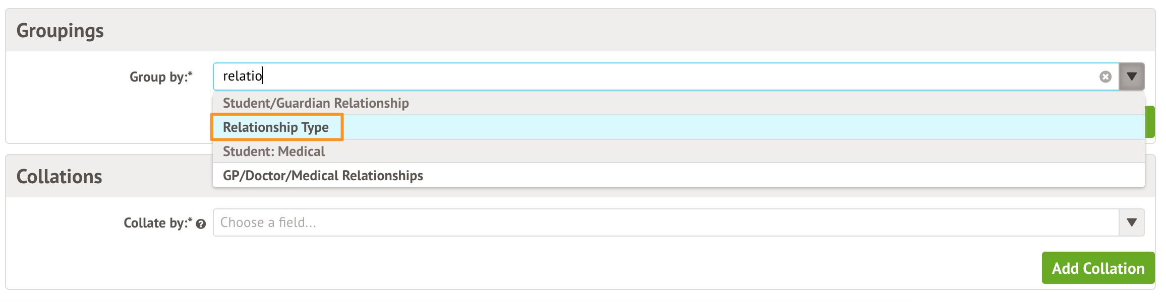 To add a grouping, scroll down to Groupings. From the drop-down, select the grouping that you are interested in, for example, Relationship Type. You can also start to type the words to narrow down the dropdown. Then click on the green Add Grouping button.