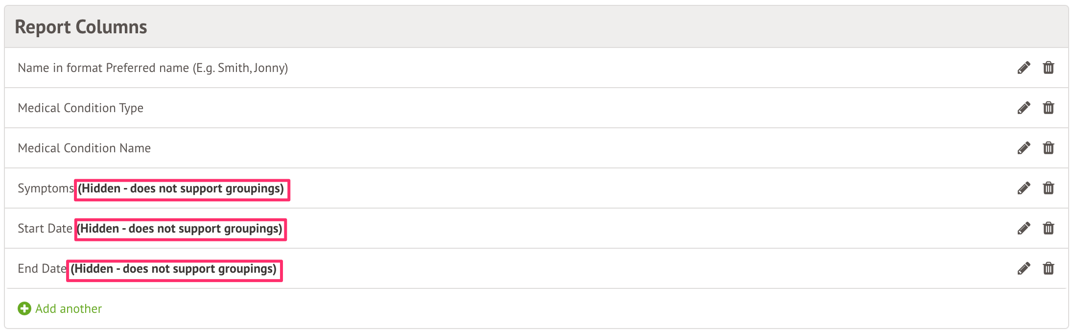For example, if you add a grouping of student name to the report, you will see how many medical conditions are logged against each student, but you would no longer see the detail of the condition such as the symptoms and start dates.