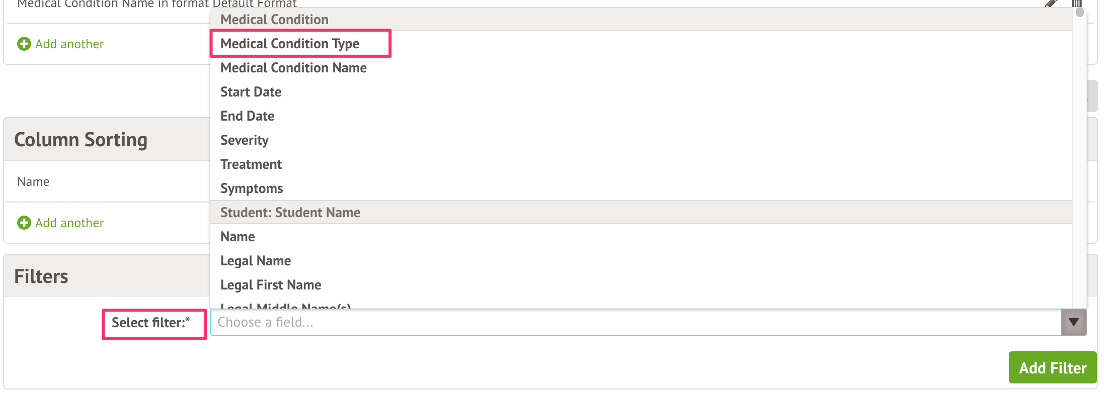 Select Medical Condition Type from the drop-down, and then click the green Add filter button on the right-hand side.