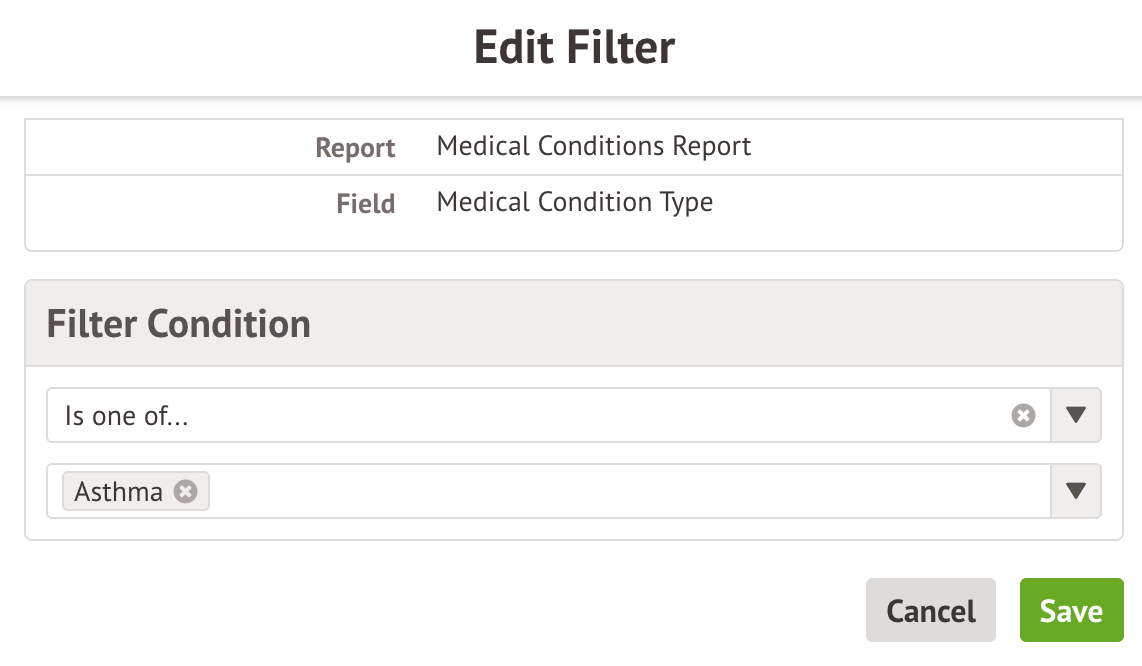 Then you can set your filter parameters. For example, to view all students with Asthma, select Is one of, then select Asthma and Save.