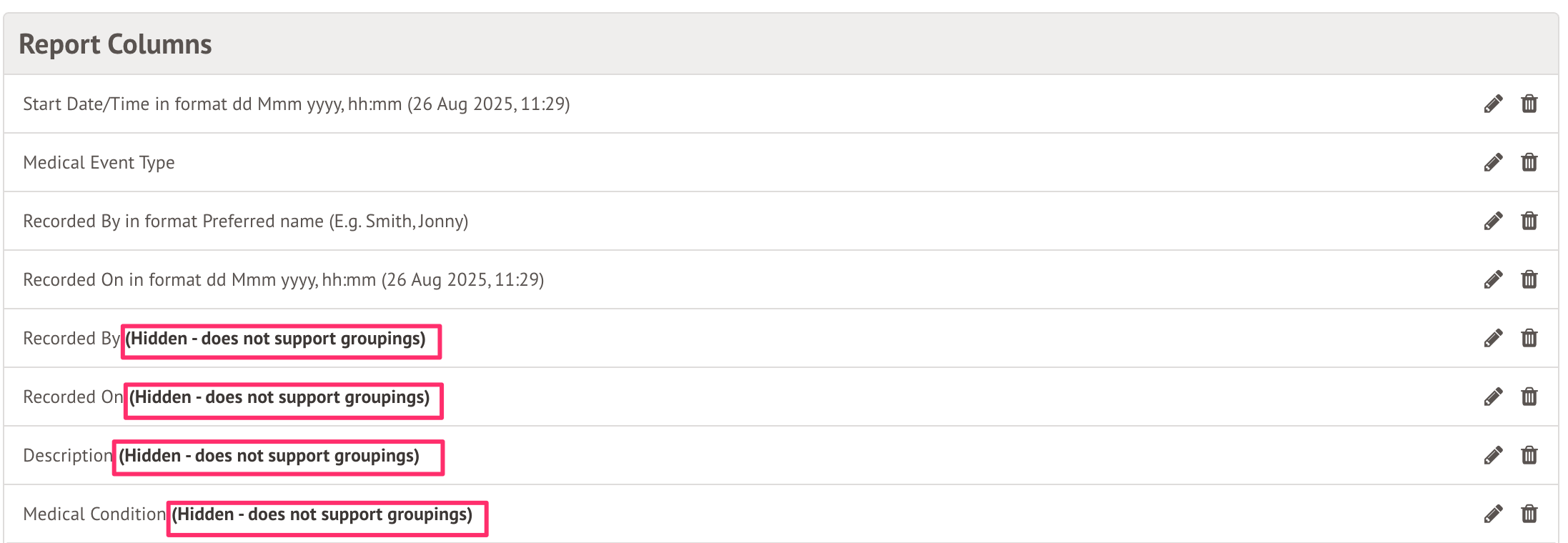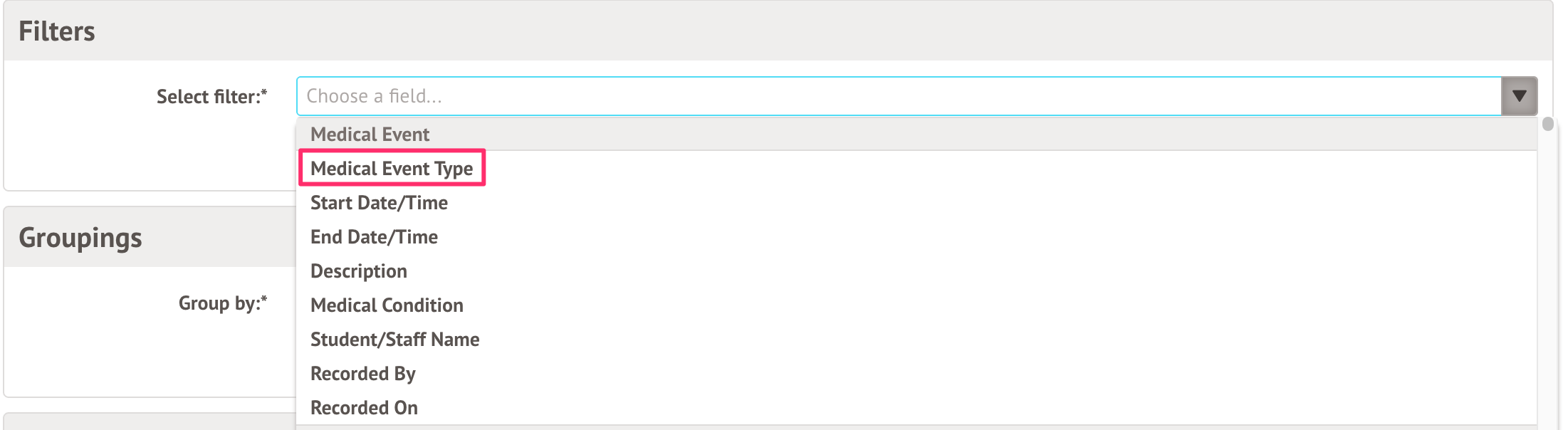 For example, if you add a grouping of student name to the report, you will see how many medical events are logged against each student, but you would no longer see the detail of the events such as the description and recorded on dates.