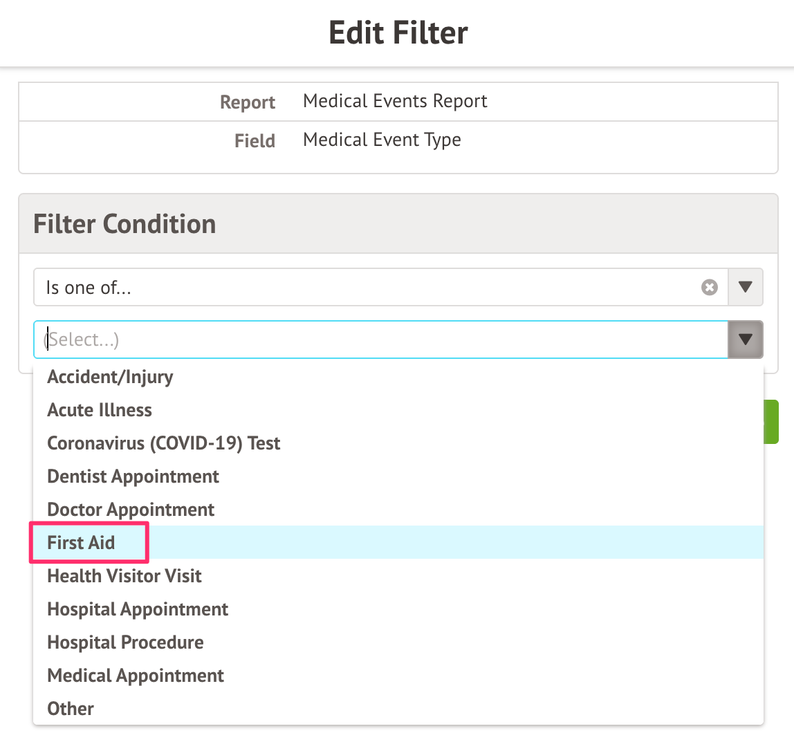 From the drop down, select the filter that you are interested in. For example, if you would like your report to only show first aid events, you could choose the Medical Event Type filter.