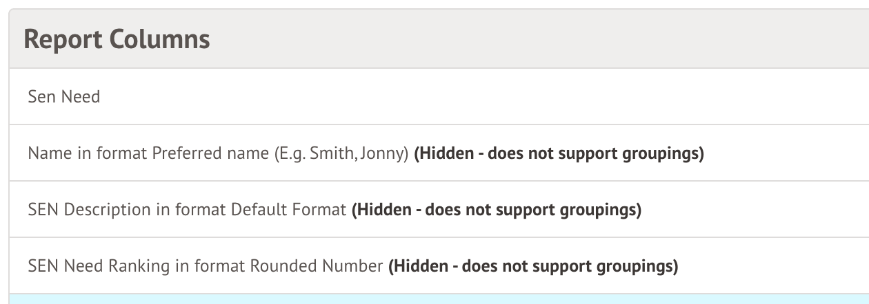 For example, if you add a grouping of SEN need to the report, you will see how many students have a certain need, but you would no longer see the detail of the note like their name, or the SEN need description by etc.