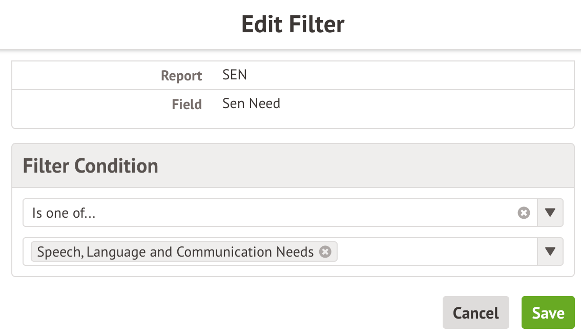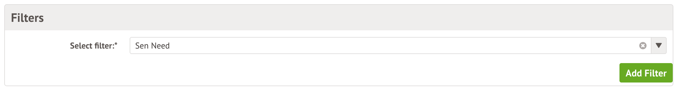 From the drop-down, select the filter that you are interested in. For example, if you would like your report to only show certain SEN needs, you could choose the Sen Need filter.