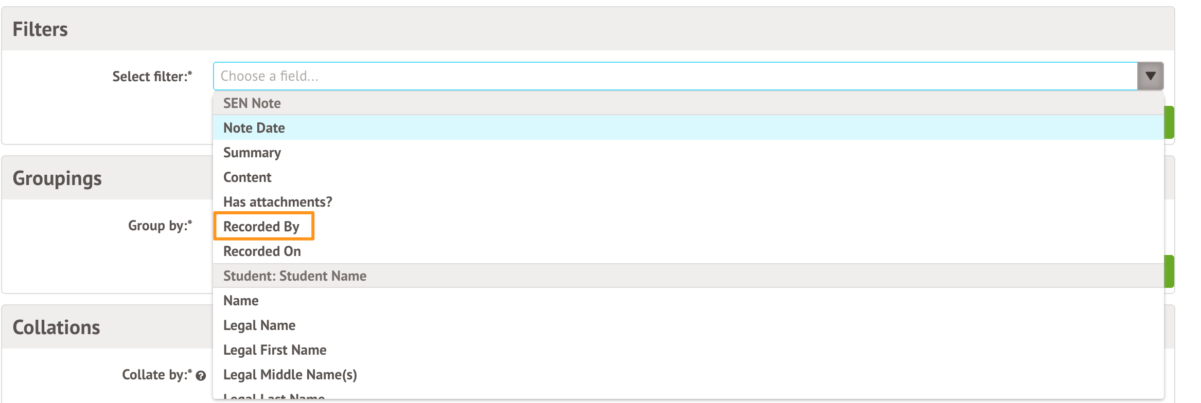 From the drop-down, select the filter that you are interested in. For example, if you would like your report to only show SEN notes recorded by a specific staff member, you could choose the Recorded By filter.