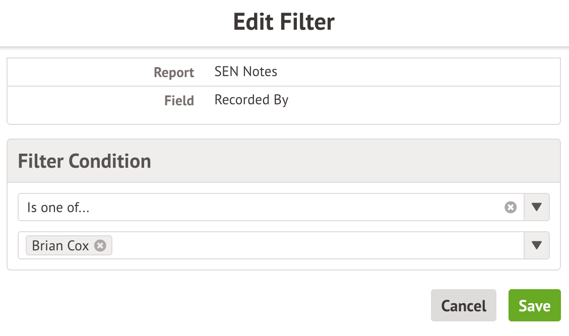 Then you can set your filter parameters. For example, if you select Filter Condition: Is one of... and then select one/multiple staff members, your generated report will only show SEN notes recorded by these staff members. Click Save to set this filter.