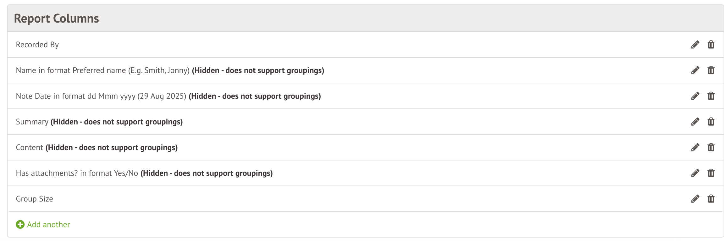 For example, if you add a grouping of Recorded By to the report, you will see the numbers of SEN notes recorded by different staff members, but you would no longer be able to see the Content details for the notes.