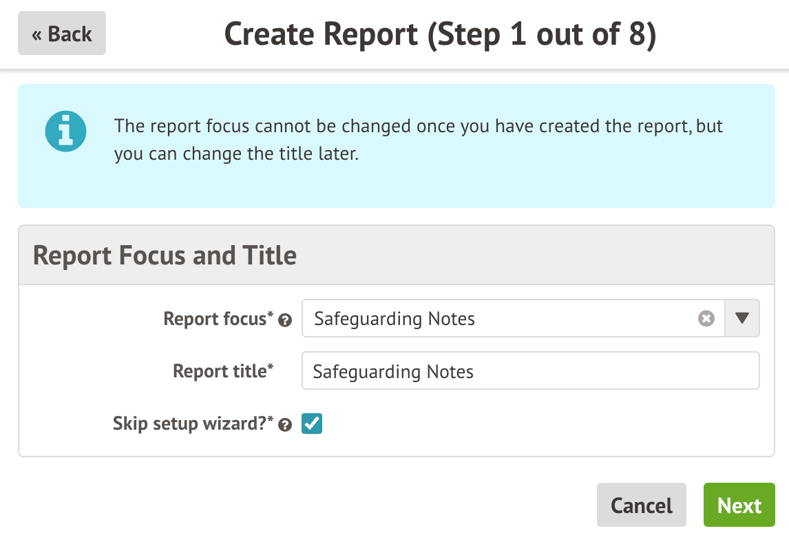 Top Tip: You may find it easier to click 'Skip setup wizard' after choosing your report focus and title to head straight to the main Edit screen.