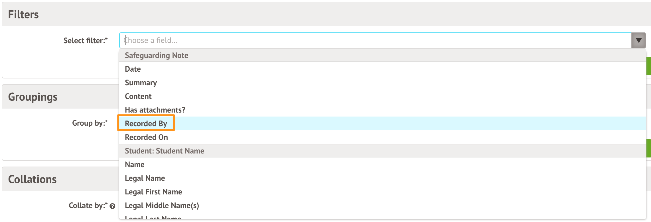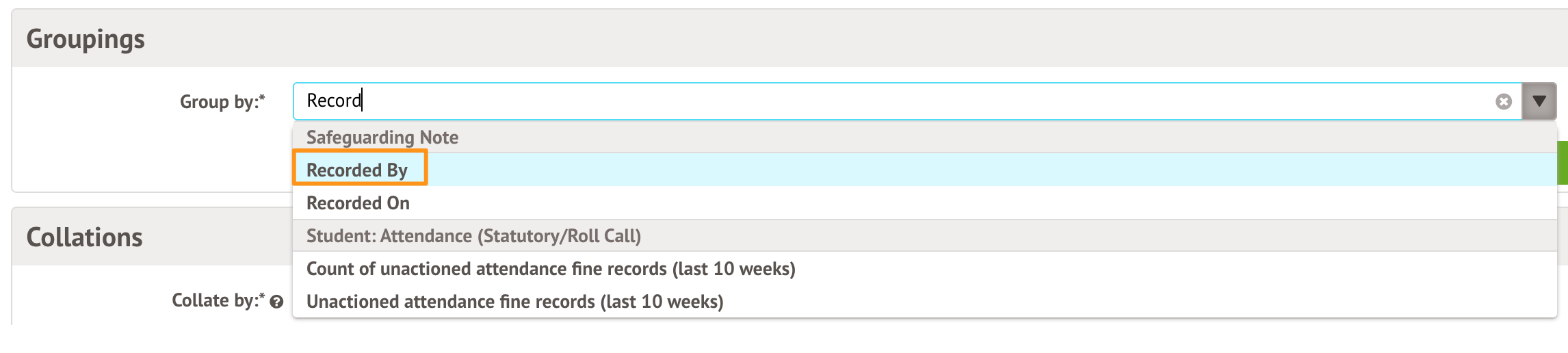 For example, if your report is a list of all safeguarding notes, but you want them to appear on separate pages depending on the Year Group(s) the student the note belongs to is in, you add a collation to do this.